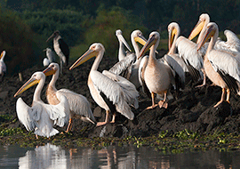 They are large water birds with a pouch under their beak. Other members include the Pelecaniformes with webbed feet and four toes. Pelicans have 8 different species worldwide; the two common pelican species found in Uganda are the Great white pelican and the Pink-backed pelicans.
